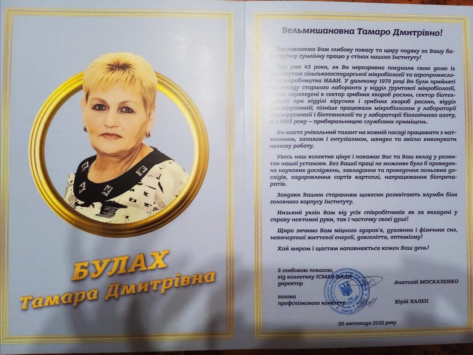 прибиральницю службових приміщень Тамару Булах, яка вже 43 роки, починаючи з 1979 року, нерозривно поєднала свою долю із нашою науковою установою. Щоденними стараннями Тамари Дмитрівни підтримувався незмінний порядок в службових приміщеннях та щовесни, зігріті турботою її вмілих рук, розквітали клумби біля головного корпусу Інституту;