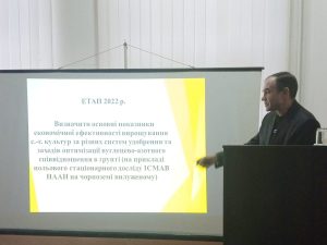 На засіданні КМР розглянуто проміжні звіти про науково-дослідну роботу за 17 завданнями ПНД, з яких 12 – фундаментальні та 5 – прикладні.Не зважаючи на військові дії, які відбувалися весною на території Чернігівщини, науковці Інституту заклали всі необхідні польові досліди, провели лабораторні та вегетаційні досліди, що дозволило отримати заплановану відповідно до Технічних завдань наукову продукцію. Зокрема, за результатами проведених у 2022 р. досліджень отримано нові наукові знання щодо процесів, які відбуваються у ґрунті і рослинах за впливу мікроорганізмів;