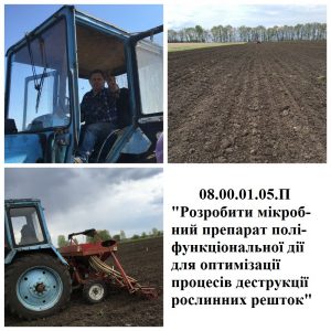 Співробітники лабораторії екології ґрунтових мікроорганізмів приступили до закладення польових дослідів з виконання науково-дослідної роботи згідно завдання 08.00.01.05.П «Розробити мікробний препарат поліфункціональної дії для оптимізації процесів деструкції рослинних решток». Метою завдання є розроблення мікробного препарату поліфункціональної дії для оптимізації процесів деструкції рослинних решток. В поточному 2023 році буде розроблено мікробний препарат полі функціональної дії для оптимізації процесів деструкції рослинних решток (проєкти: дослідно-промисловий регламент та ТУ У (технічні умови) на виробництво мікробного препарату). Буде складено та подано заяву в Державне підприємство «Український інститут промислової власності» для отримання патенту України на спосіб виготовлення мікробного препарату поліфункціональної дії для оптимізації процесів деструкції рослинних решток, які сприятимуть підвищенню родючості ґрунтів.
